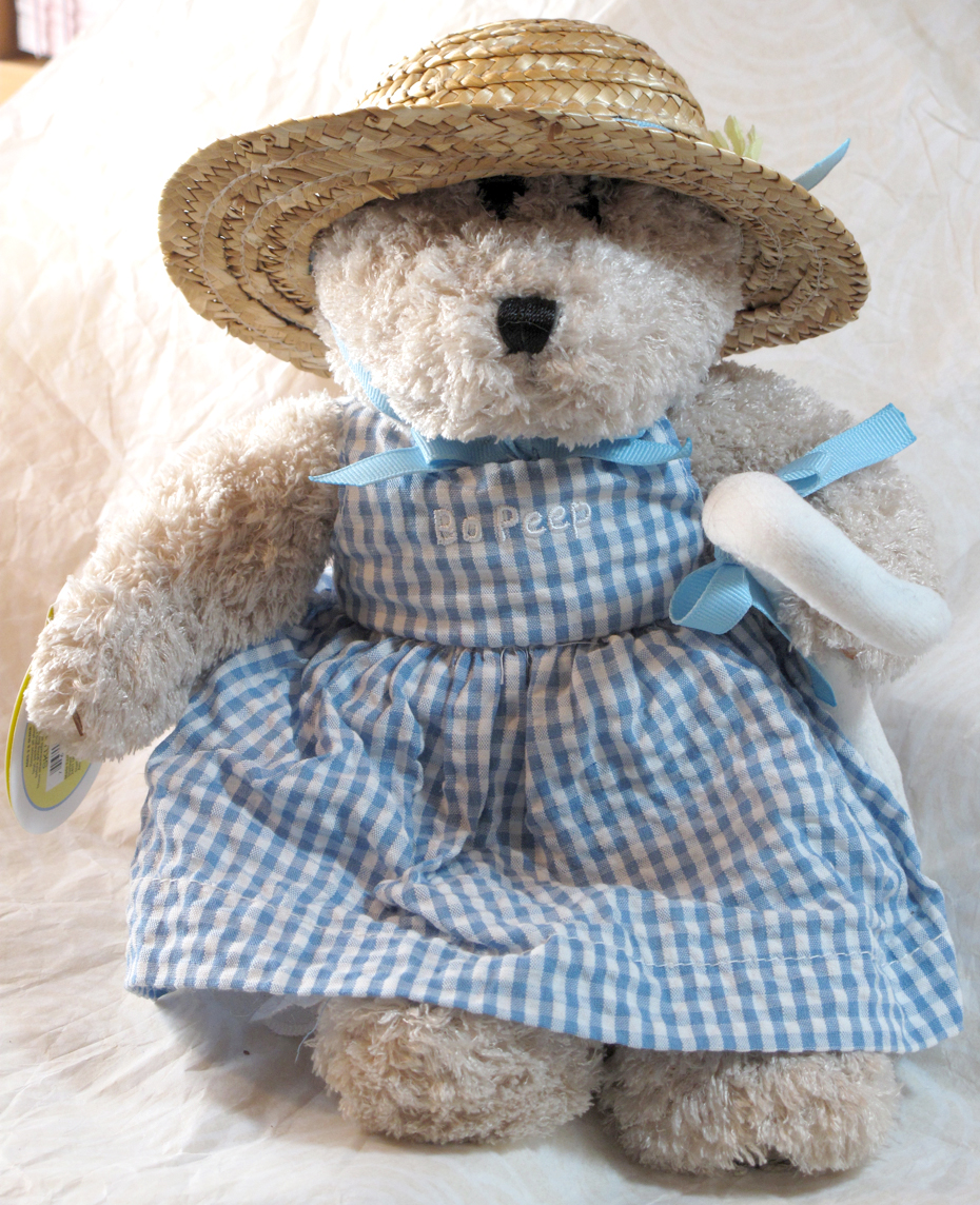 These three bears came out at the same time. The black sheep and the white sheep are 31st in the series and Bo-Peep Bearista is the 30th edition in the series. All of the bearistas are from Spring 2004. The sheep bearistas have super super fuzzy fur and have little bells around their necks so Bo-Peep can keep track of them! Bo Peep is wearing a blue gingham dress with white eyelet underclothes and she has a staff for the sheep and is wearing a straw hat with blue ribbons and a yellow flower. Bo Peep is also quite fluffy, but not as fluffy as the sheep of course! A very cute collection from 2004! Click to enlarge. 🙂
