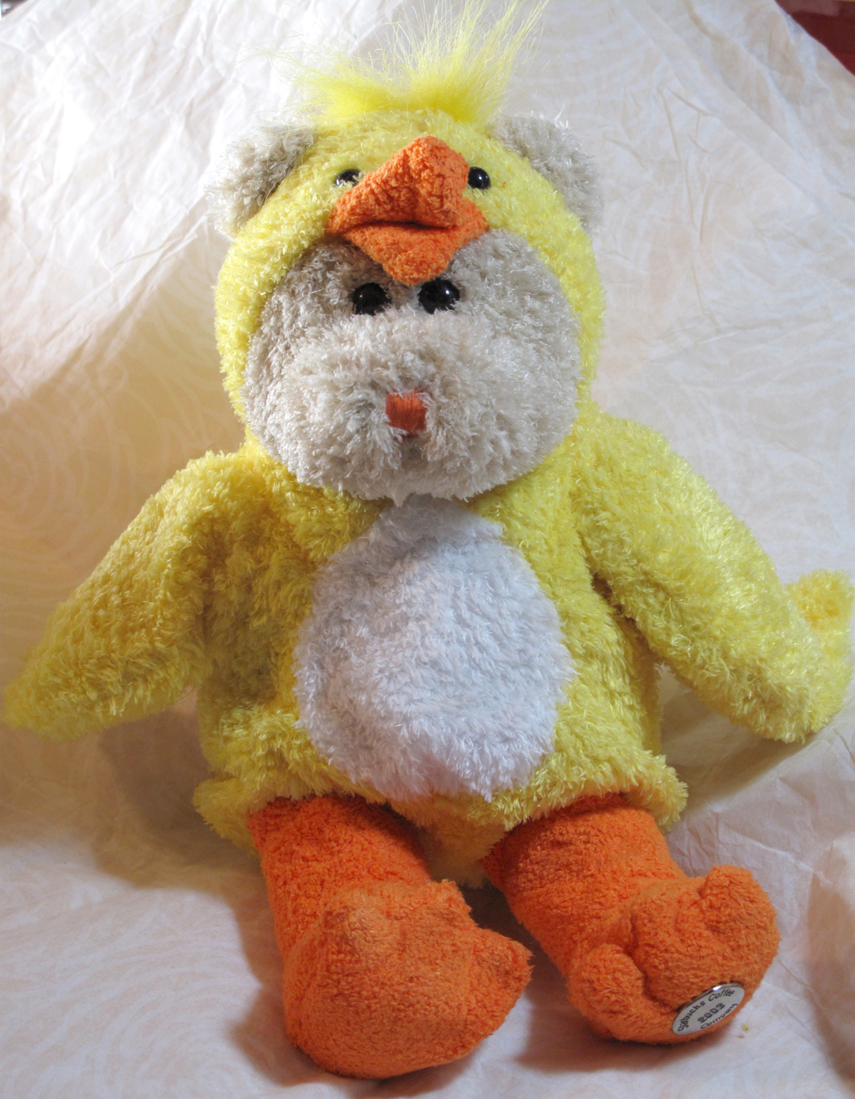 You know Spring has arrived when the baby chicks start popping out! Well, here we have the 2003 Yellow Chick Bearista that is the 25th Edition in the series. This bear has the older style fuzzy fur and an orange nose with orange chick feet and an orange beak in the chick hood on his head! The chick suit is yellow with a cute tuft of yellow fur on the very top of his head. He also has a metal tag on his left foot with the year indicated. A great bear! 🙂 Click to enlarge. 🙂