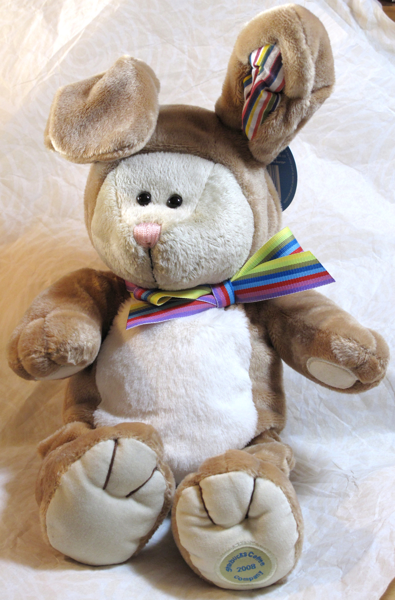 This is one of the oldest Bearistas that I own! Although it doesn’t say the year on the tag, according to BearistaTales.com, this bunny Bearista is from 1998 and is the third Bearista in the series! He is a really different style of bear than the recent bears. He has slightly shaggy fur and is a bit thinner and taller than most of the bearistas. His apron says “Starbucks Bearista Bunny.” Very adorable with his floppy ears! Click the photo to enlarge. 🙂